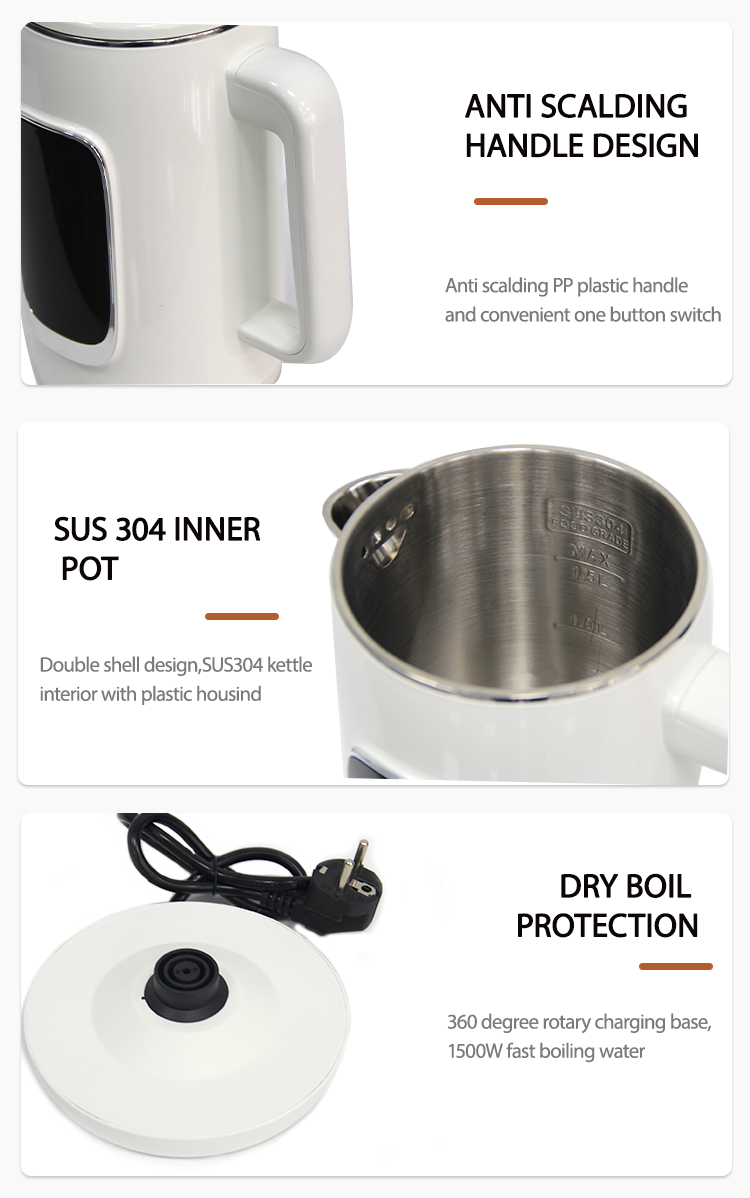 El diseño de doble carcasa de nuestro hervidor eléctrico incluye una olla interior SUS 304 con una carcasa de plástico. Esto garantiza durabilidad y longevidad, para que pueda disfrutar de su hervidor durante muchos años.